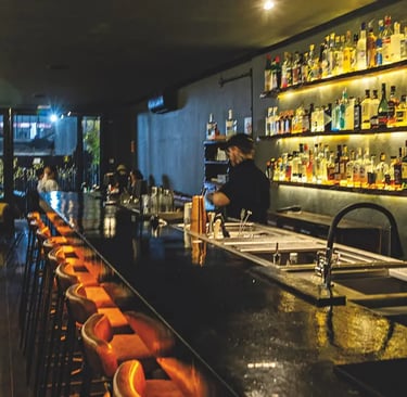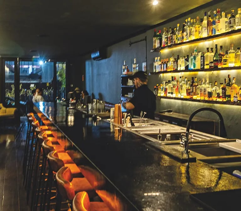 " O Dopa é um bar de bartenders. as paredes de tijolos pintados de preto e as mesinhas pontuadas por pequenas luminárias recebem o público fã de coquetelaria. atrás do balcão, igualmente escuro, trabalham profissionais do ramo "
